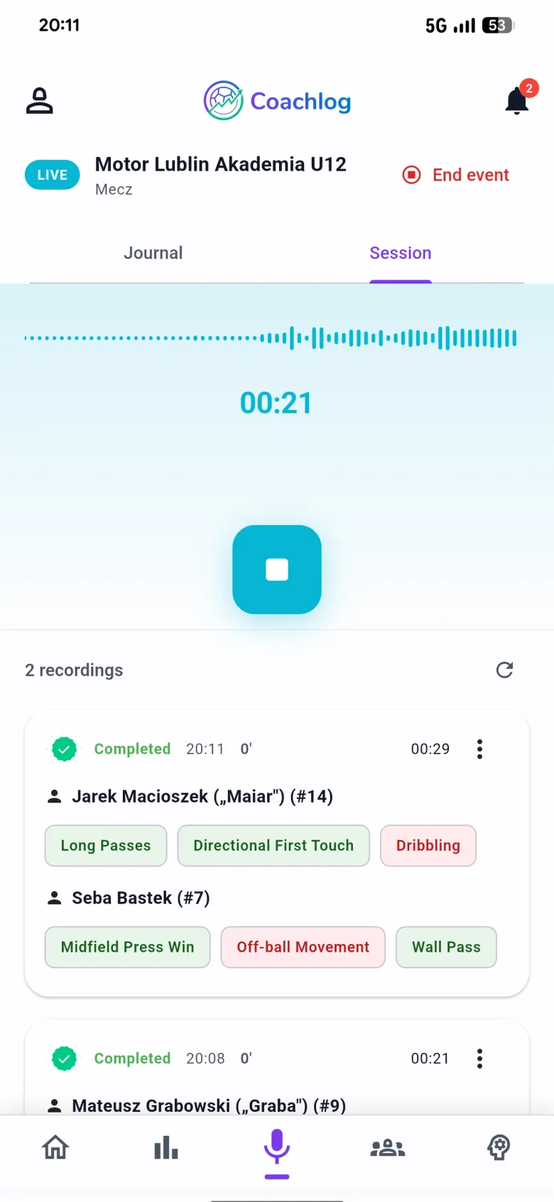 - Tuesday / Thursday training: Veo stays home. Coachlog captures 40–60 voice notes across drills, small-sided games, and individual technique work. Players get PDF reports on Friday.